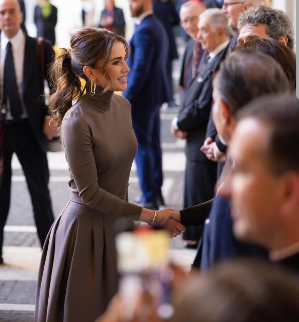 كذلك زارت برفقة سيدة ايطاليا الاولى، معرض “الاردن: فجر المسيحية” في روما. حيث تالقت باطلالة جمعت البني والذهبي من ماركة ماكس مارا، وحذاء اصفر من “اكوازورا”.